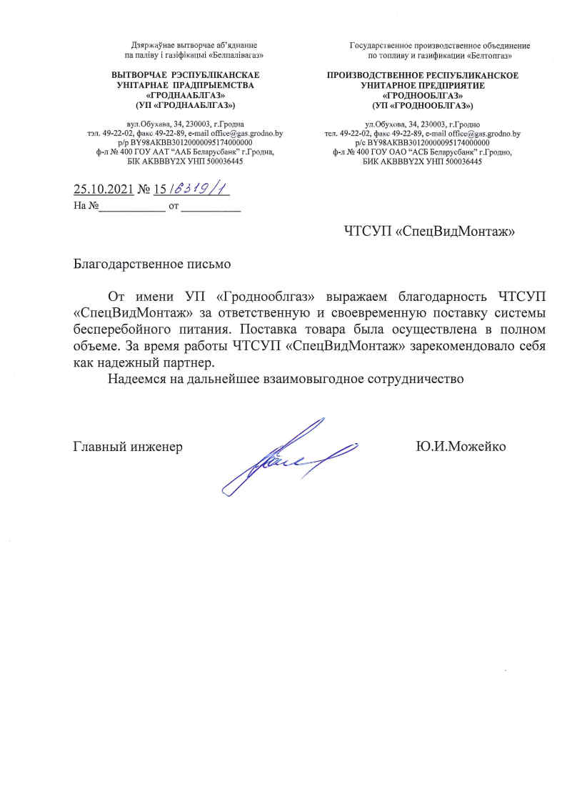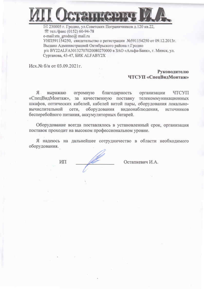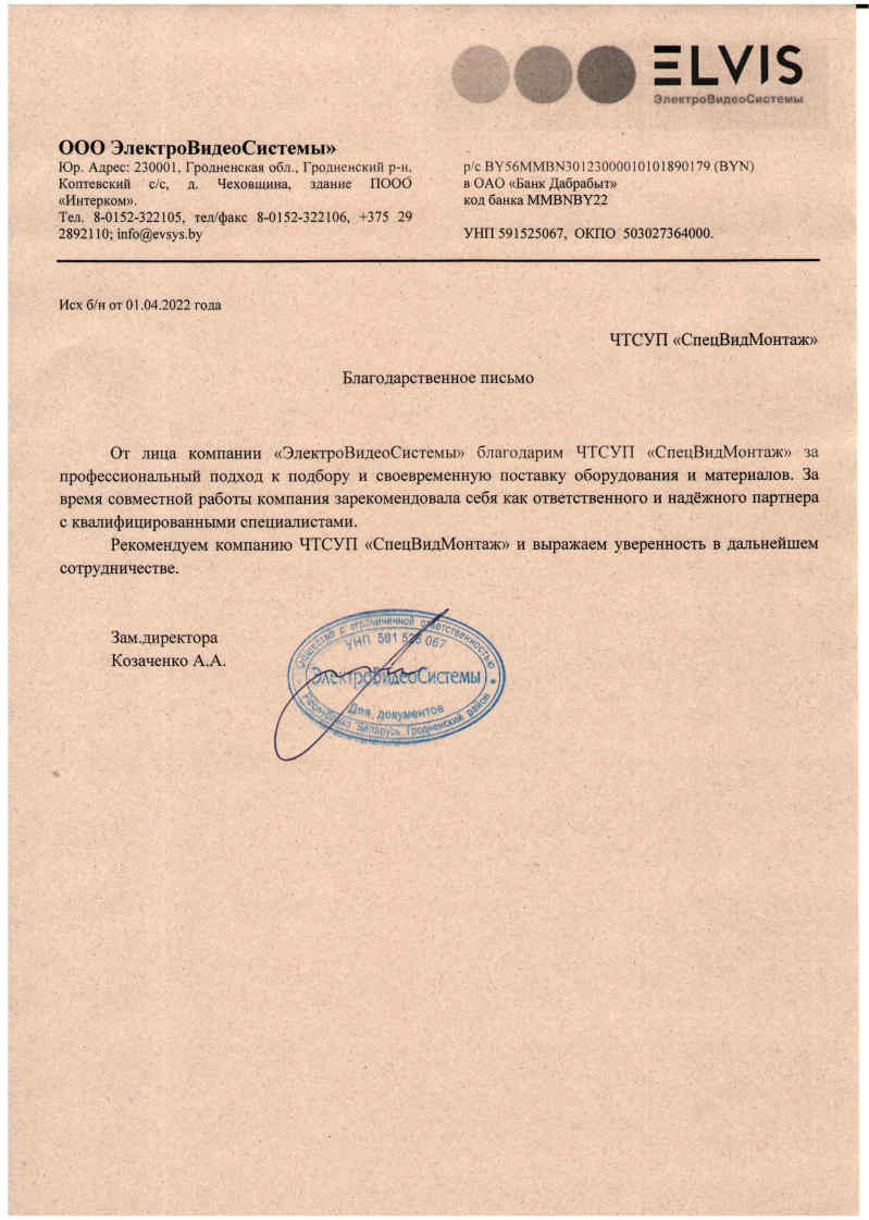 За 8 лет работы, компания «СпецВидМонтаж» установила крепкое и взаимовыгодное сотрудничество со многими постоянными клиентами. В настоящий момент в активе компании более 100 отзывов от благодарных клиентов. В данном разделе представлены рекомендательные письма и отзывы о работе сотрудников «СпецВидМонтаж» от некоторых из этих компаний.
